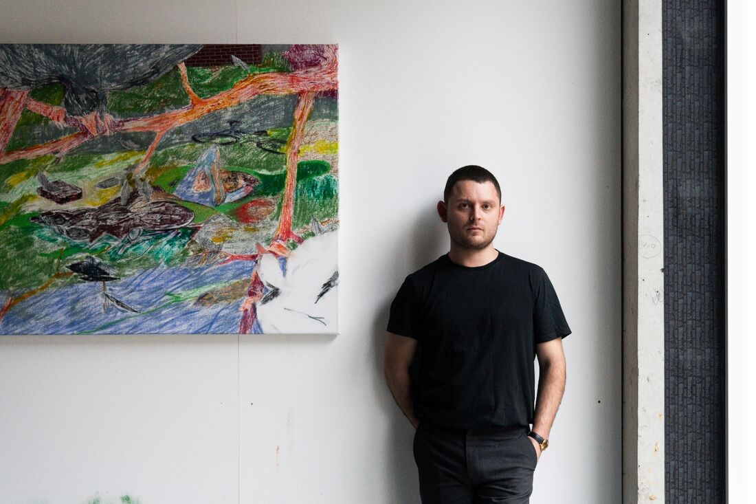 Born in Palo Alto, California in 1992, Curchod creates vivid paintings in which his subjects find themselves surrounded by exaggerated surroundings and diffuse backgrounds. He begins with sketches with oil sticks to create a basic background before applying turpentine with various tools for gesturing marks. He then finishes with oils and charcoal to refine the representation of his objects and figures.
