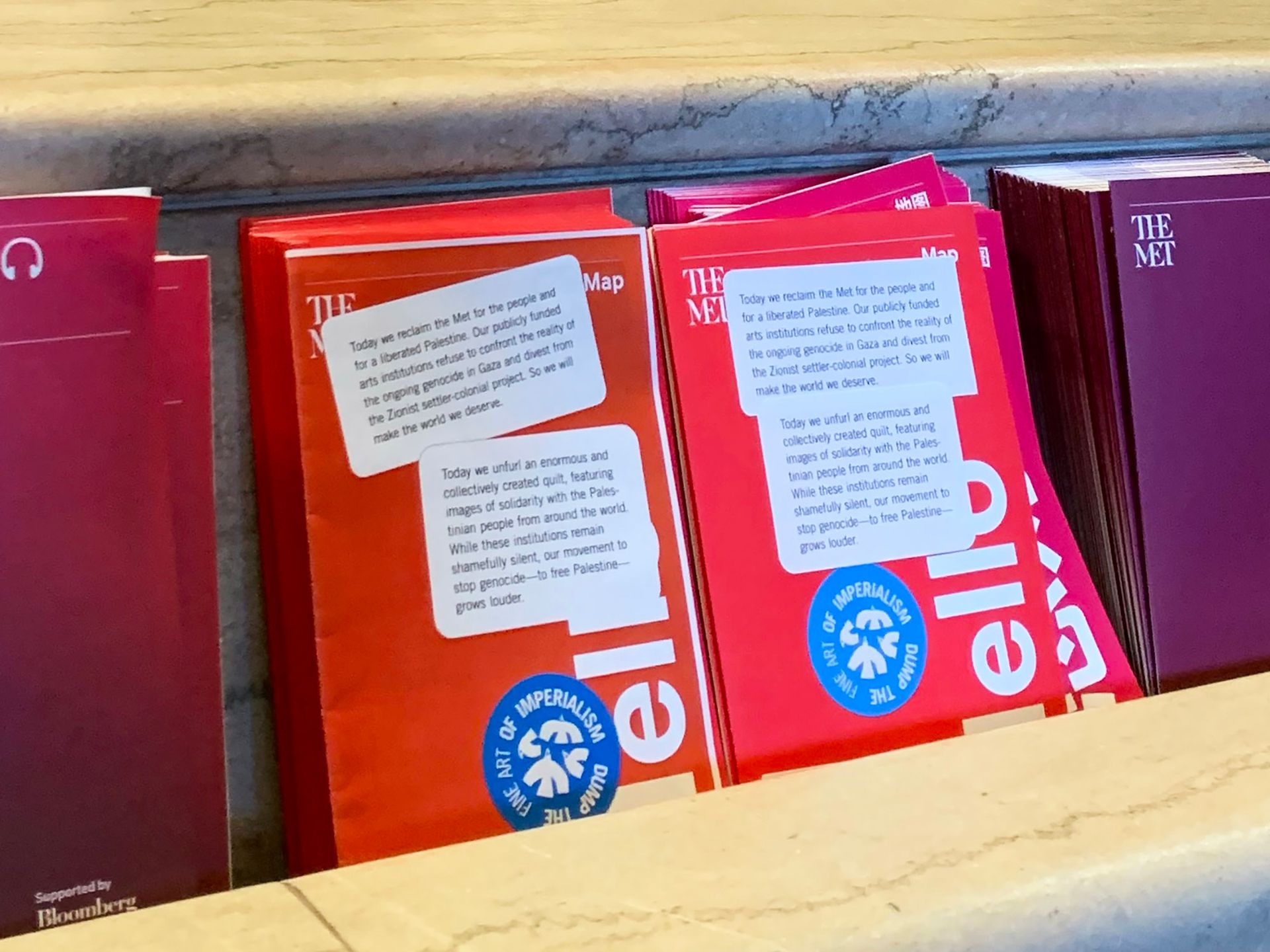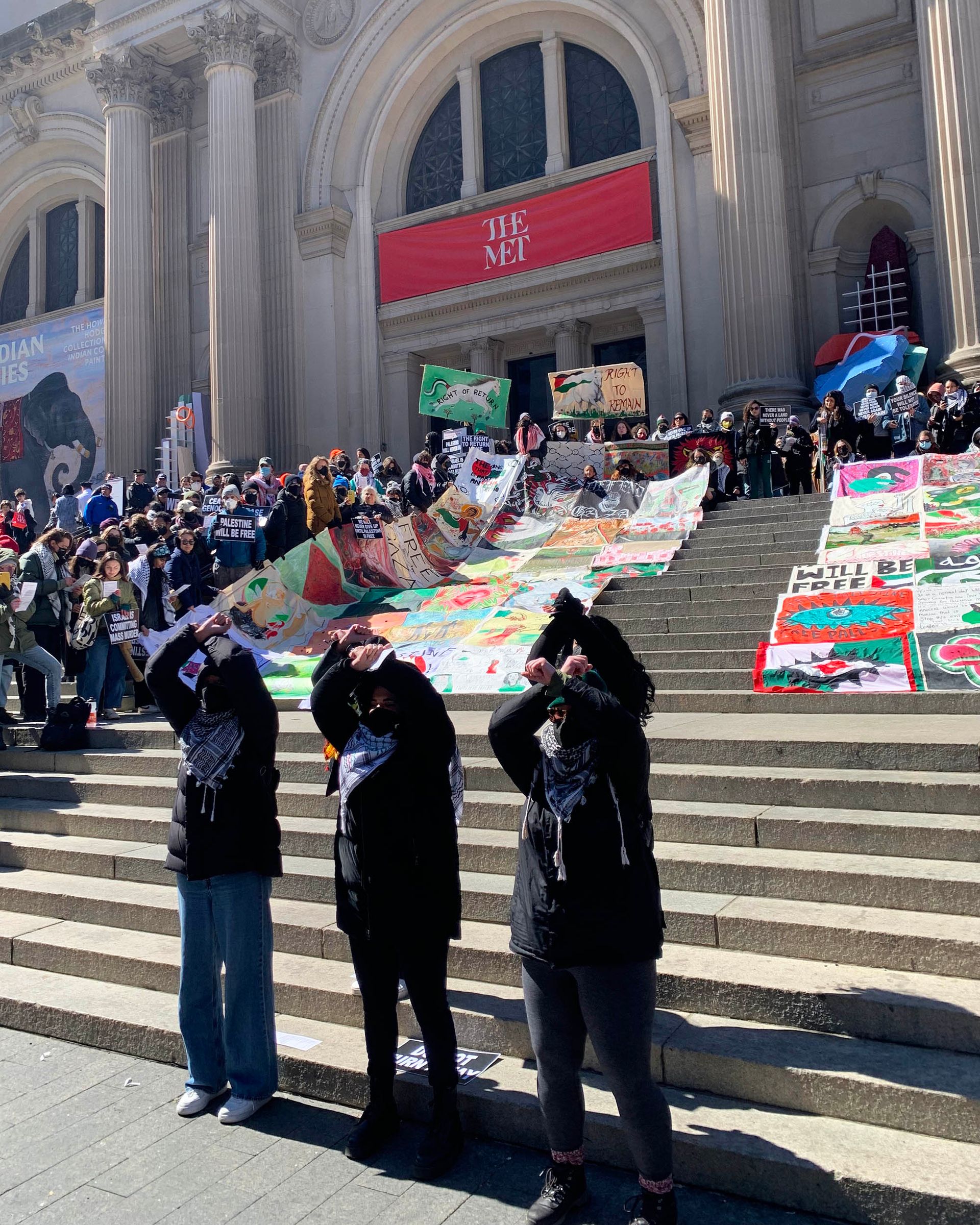Pamphlets handed out by activists outside the museum and inside its Great Hall outlined the aims of the protest and called on the organization to sever ties with three longtime friends, whom they see as complicit in the current crisis in Gaza. These include cosmetics magnate, Neue Galerie founder and World Jewish Congress President Ronald Lauder (“he has been key in promoting the conflation of anti-Zionism and anti-Semitism,” according to the pamphlet), Morgan Stanley CEO Edward Pick (his company has more than $3 billion (at the arms and aerospace company Raytheon Technologies, which has benefited from US military aid to Israel) and Michael Steinhardt—a collector who has turned over more than 100 stolen antiquities, more than 20 of which are said to have come from the West Bank. to the pamphlet