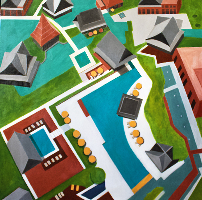 In Chinese Houses, Silber-Delerive takes us high above a neighborhood that feels both distant and strangely familiar. The view is straight down—no horizon, no figures, no sound. Just a calm geometry of rooftops, waterways, and muted colors. The scene unfolds like a map someone forgot to label. A cluster of pagoda-style houses fills the square canvas, arranged around pools and winding water channels. From this height, everything flattens and organizes itself into patterns. The repetition of roofs becomes almost hypnotic, like a quiet mantra of architecture and design.